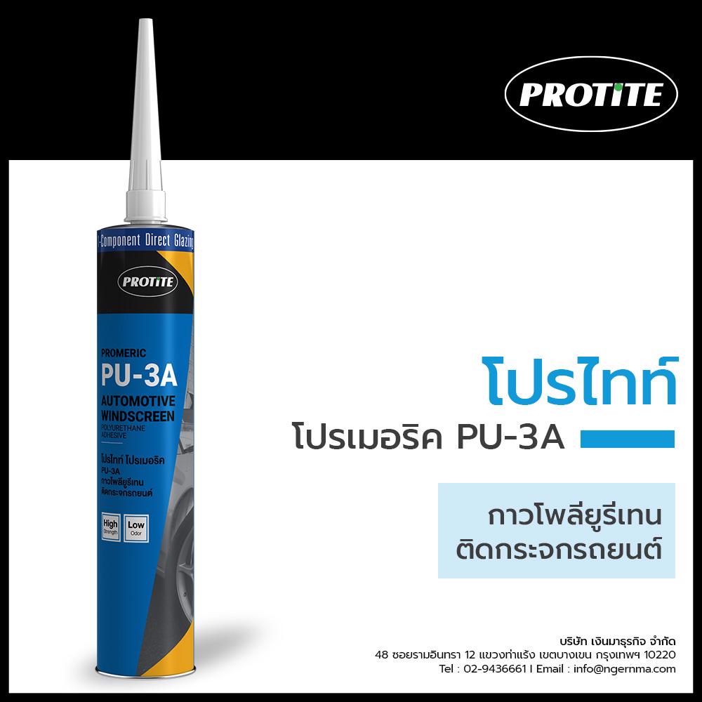 โปรไทท์ โปรเมอริค PU-3A กาวติดกระจกรถยนต์ (สูตรพรีเมียม แรงยึดเกาะสูง กลิ่นน้อย) เป็นกาวโพลียูรีเทน ส่วนที่ได้รับการออกแบบมาสำหรับใช้ในการติดตั้งกระจกรถยนต์ด้วยระบบ Direct Glazing สามารถใช้ได้กับ รถยนต์ รถโดยสาร รถบรรทุก และรถเพื่อการก่อสร้าง เช่น แบคโฮ ทุกชนิด ใช้งานง่าย ไม่ไหลย้อย และแห้งตัวเร็ว โดยการแห้งตัวเกิดจากการทำปฏิริยาเคมีกับความชื้นอากาศ เมื่อแห้งตัวแล้วจะแปรสภาพเป็นยางที่สามารถรองรับการเคลื่อนไหวของกระจกและตัวถังรถได้ดี มีแรงยึดเกาะสูง และสามารถช่วยป้องกันการรั่วซึมของนํ้า อากาศ เสียง และการสั่นสะเทือนได้กาวติดกระจกรถยนต์ชนิดไม่ต้องใช้น้ำยารองพื้น (Primerless) โดยสามารถยึดเกาะได้ดีกับกระจกและตัวถังโดยไม่ต้องใช้น้ำยารองพื้น แต่หากต้องการเพิ่มประสิทธิภาพการยึดเกาะสามารถใช้กาวโพลียูรีเทนติดกระจกรถยนต์ โปรไทท์ โปรเมอริค PU-3A ร่วมกับน้ำยารองพื้น โปรไทท์ โปรเมอริค Primer-One ได้**สามารถใช้คู่กับน้ำยาทารองพื้น PRIMER ONE เพื่อเพิ่มประสิทธิภาพแรงยึดเกาะที่ดีเยี่ยมสี : สีดำขนาดบรรจุ หลอดอลูมิเนียม 310 มล./หลอด