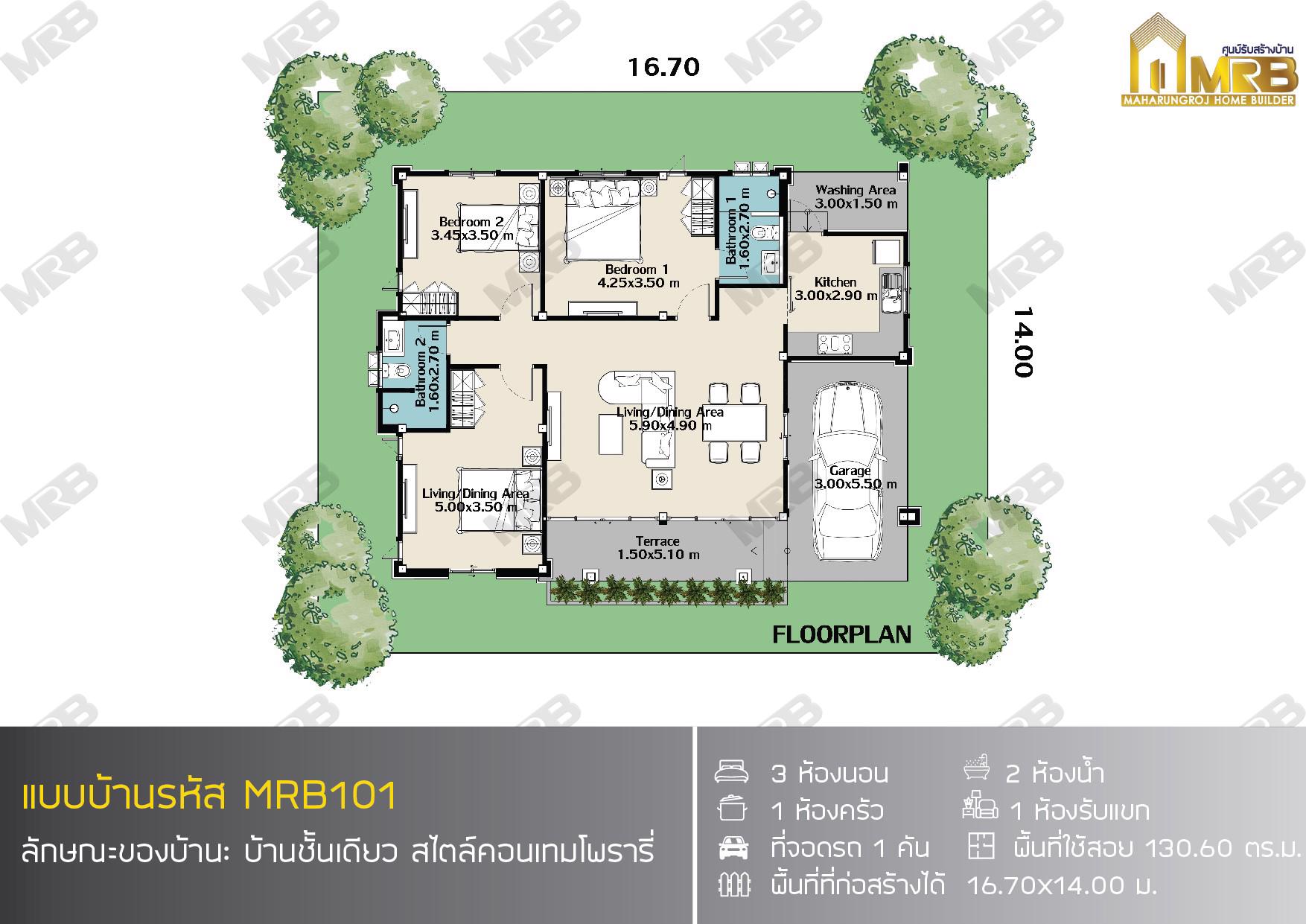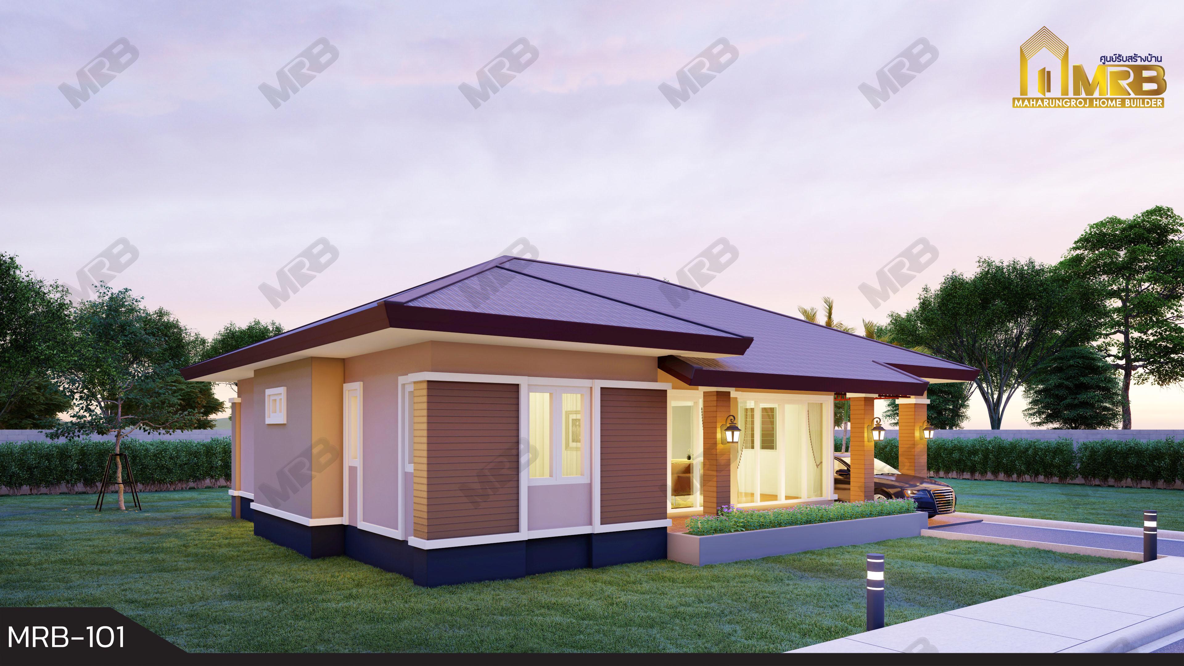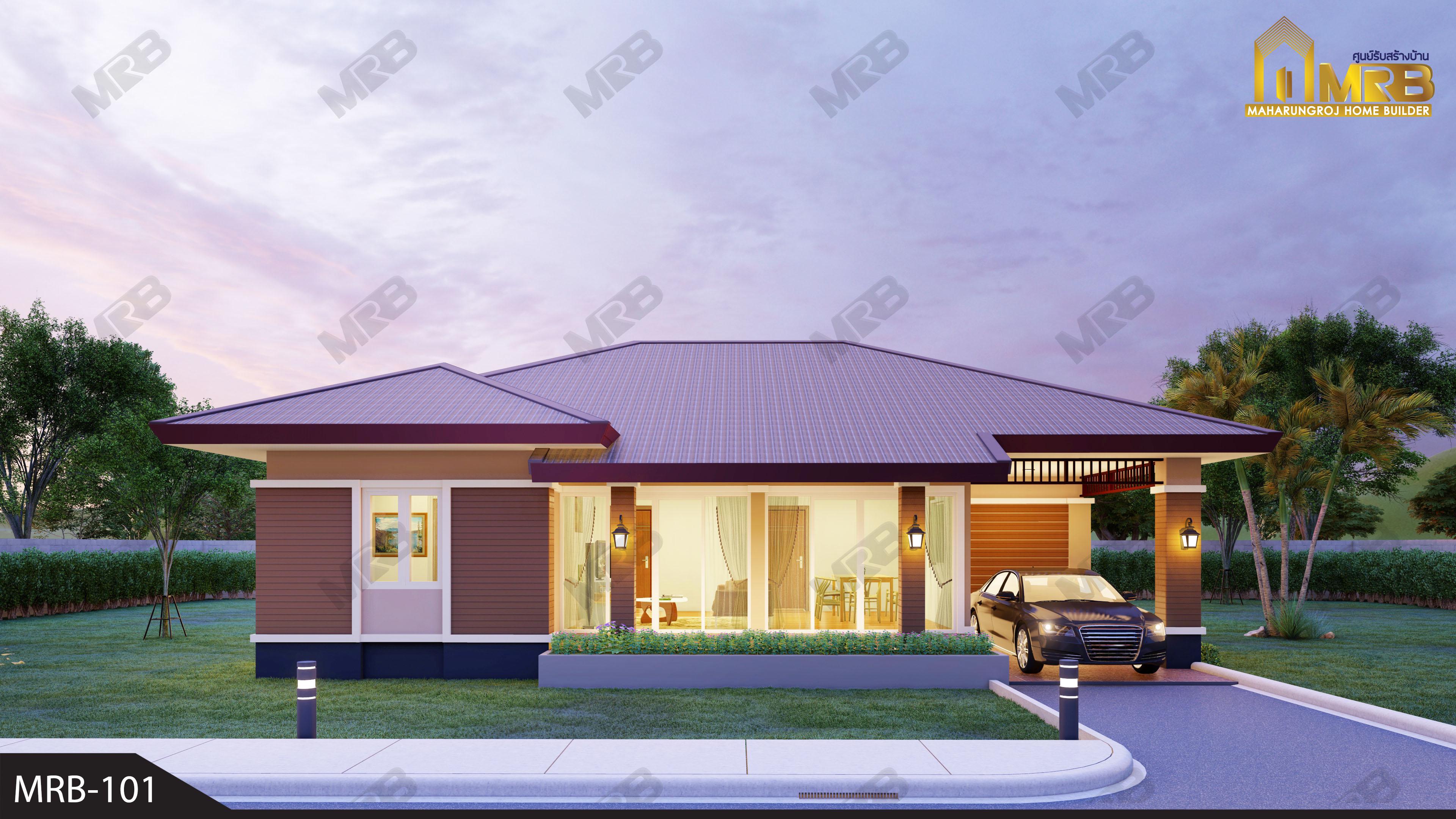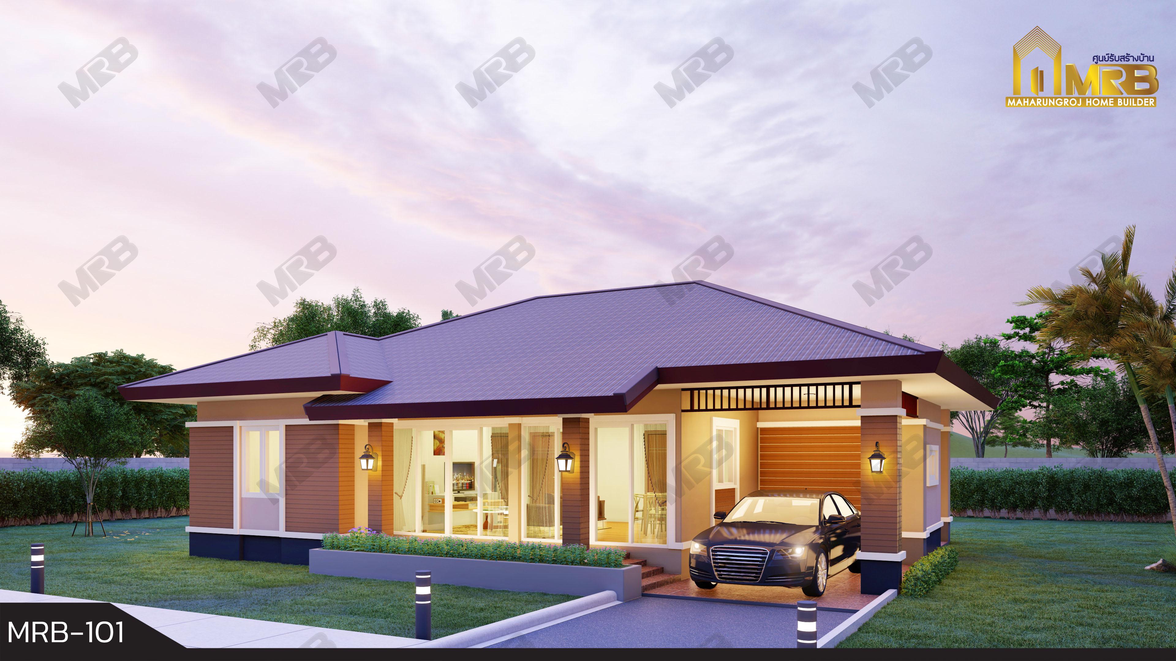 แบบบ้านสไตล์ Contemporary หลังคาทรงปั้นหยา (Hip) ขนาด 3 ห้องนอน 2 ห้องน้ำ พร้อมที่จอดรถ 1 คันเหมาะกับคนรุ่นใหม่ที่อยู่อาศัยกับครอบครัวขนาดเล็ก เน้นห้องโถง ห้องรับแขกกว้างขวาง เพื่อให้ครอบครัวได้ใช้พื้นที่ส่วนกลางทำกิจกรรมร่วมกัน โดยห้องครัวออกแบบให้มีความเป็นสัดส่วน