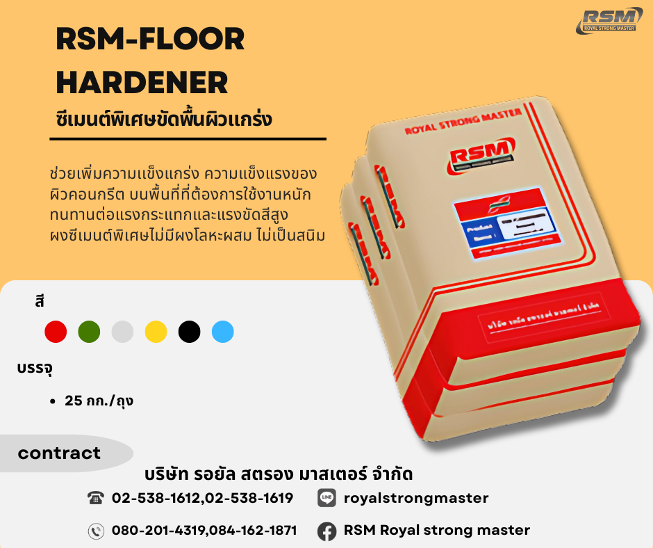 RSM FLOOR HARDENER ซีเมนต์พิเศษขัดพื้นผิวแกร่ง เป็นซีเมนต์ช่วยเพิ่มความแกร่ง แข็งแรงของผิวคอนกรีต บนพื้นที่ๆ ต้องการใช้งานหนัก ยืดอายุการใช้งานของพื้นผิว ให้ยาวนานขึ้น และไม่เกิดฝุ่นบนผิว ทนทานต่อแรงกระแทกและแรงขัดสีสูง ผงซีเมนต์พิเศษไม่มีผงโลหะผสม ทำให้ไม่เป็นสนิม ขนาดบรรจุ: 25 กิโลกรัม/ถุง สี : เขียว แดง เทา ธรรมชาติ