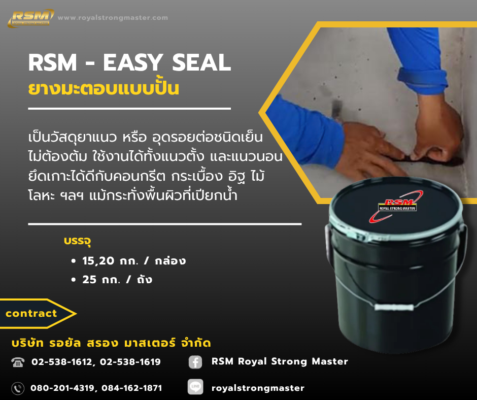 RSM JOINT SEAL ยางมะตอยหยอดร่อง เป็นผลิตภัณฑ์ ที่ผสมสารโพลิเมอร์ชนิดพิเศษ ใช้หยอดร่องรอยต่อ รอยแตกร้าวของพื้นผิวคอนกรีต หยอดได้อย่างต่อเนื่อง ให้ความยืดหยุ่นดี ป้องกันความชื้นและสิ่งแปลกปลอม ผ่านลงไปในร่องรอยต่อและรอยแตกร้าว RSM EASY SEAL ยางมะตอยแบบปั้น ยางมะตอยแบบปั้น เป็นวัสดุยาแนวหรืออุดรอยต่อชนิดเย็น ไม่ต้องต้ม ใช้งานได้ทั้งแนวตั้งและแนวนอน ยึดติดได้ดีกับคอนกรีต กระเบื้อง อิฐ ไม้ โลหะ แม้กระทั่งผิวที่เปียกน้ำ ขนาดบรรจุ : 20 กก./กล่อง, 25 กก. /ถัง สินค้าอื่น ๆ ของบริษัทฯ