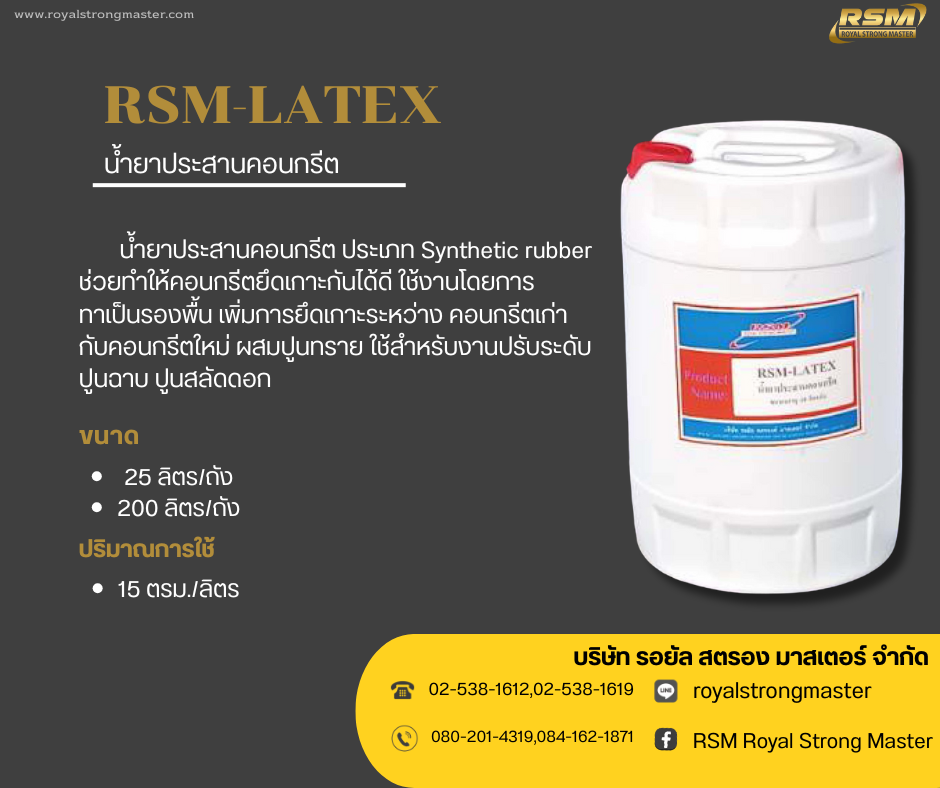 RSM LATEX น้ำยาประสานคอนกรีต เป็นน้ำยาประสานคอนกรีตประเภท Synthetic Rubber มี Co-Polymer ช่วยทำให้คอนกรีตยึดเกาะกันได้ดี โดยทาเป็นรองพื้น เพิ่มการยึดเกาะระหว่างคอนกรีตเก่ากับคอนกรีตใหม่ และผสมปูนทรายใช้สำหรับงานปรับระดับ ปูนฉาบ สลัดดอก **สามารถใช้งานได้ 15 ตร.ม./ลิต** ขนาดบรรจุ : 25 ลิตร/ 200 ลิตร