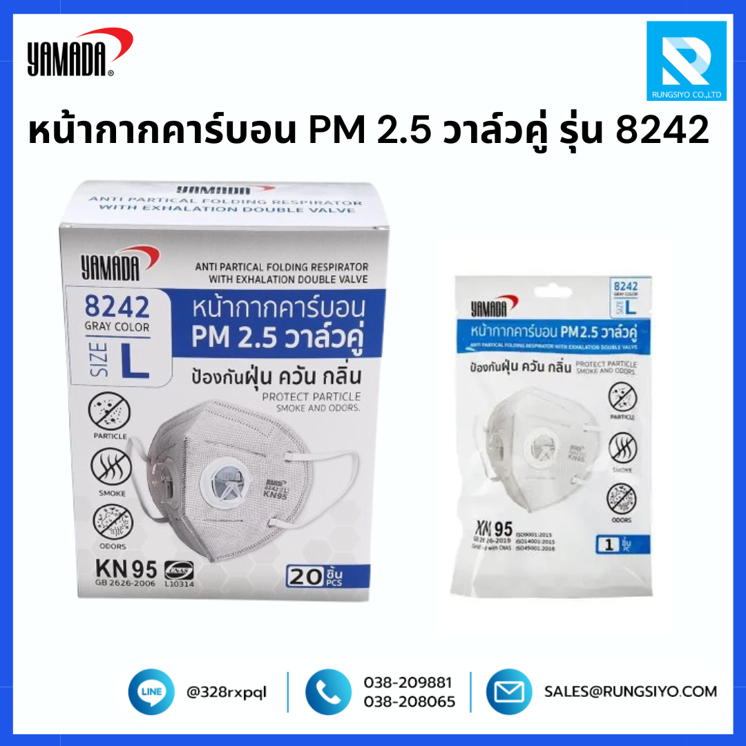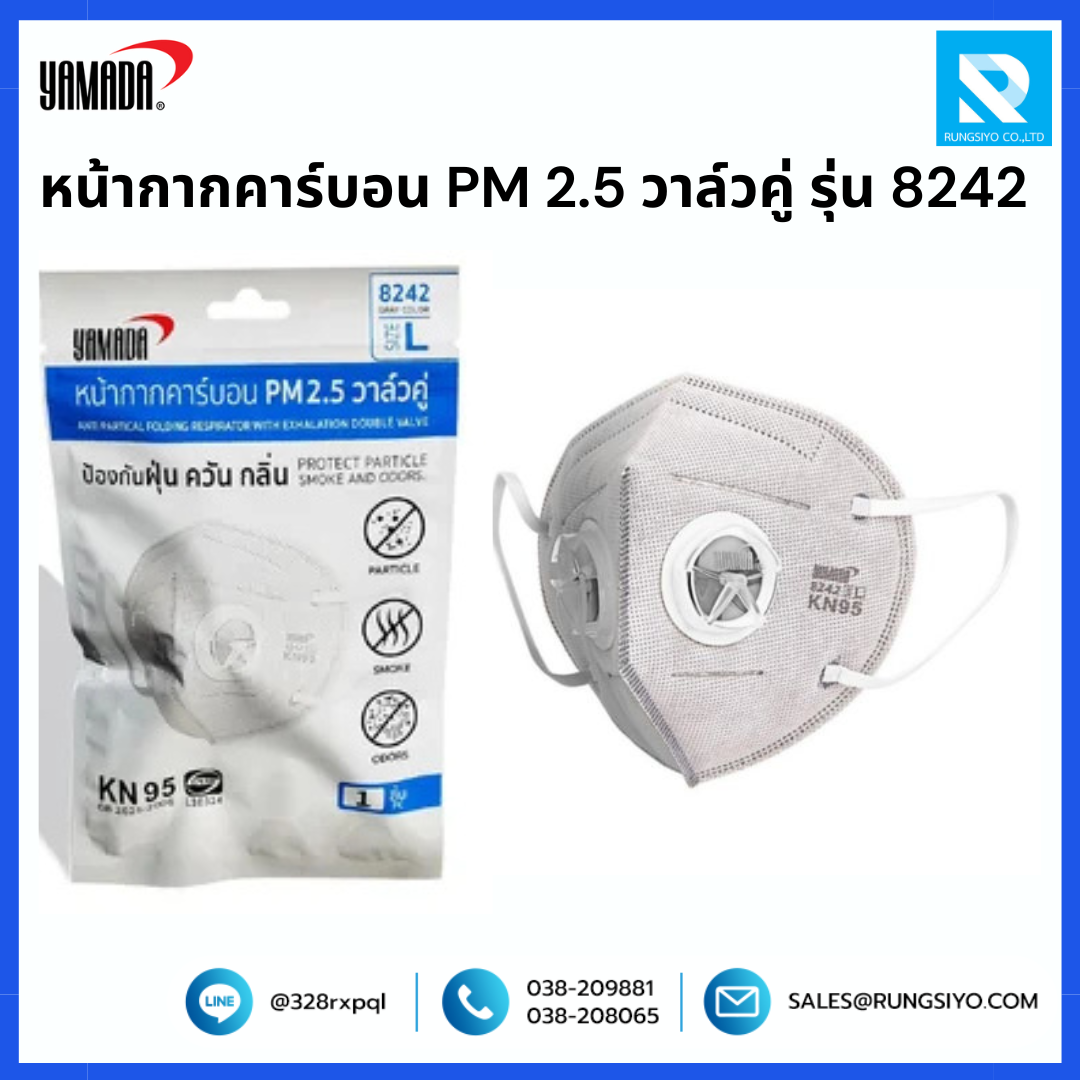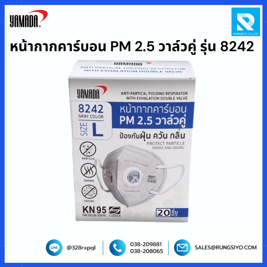 หน้ากากอนามัยคาร์บอน ดับเบิ้ลวาล์ว แบบพับ รุ่น 8242 ดีไซน์รูปทรงสามเหลี่ยม ผสมผงคาร์บอนช่วยป้องกันฝุ่นควันและกลิ่นเหม็นได้เป็นอย่างดี รูปทรงใหม่สามารถขยับปากและจมูกได้สะดวกมากขึ้น มีวาล์ว 2 ตัวช่วยในการหายใจได้สะดวก ระบายความร้อนได้มากกว่าวาล์วเดียวพับเก็บได้สะดวกสายรัดเป็นโพลีเอสเตอร์ สีขาวยืดหยุ่นได้ดี การเย็บแบบ Triangle Design กระชับใส่สบาย ขอบหน้าแปลนแนบสนิทกับใบหน้าเพื่อเพิ่มความปลอดภัย เหมาะสำหรับ งานที่ต้องเจอกับปัญหาฝุ่นควันในปริมาณมาก เช่น ตำรวจจราจร พนักงานเก็บเงินบนทางด่วน เป็นต้น วิธีการใช้งาน วางหน้ากากอนามัยไว้ที่ปลายนิ้วมือ โดยที่แถบโลหะควรจะอยู่ด้านบนและสายรัดยางยืดจะต้องห้อยอยู่ด้านล่างของมือ สวมหน้ากากอนามัยคาร์บอนให้คลุมใต้คางและจมูก จากนั้นให้ดึงสายรัดยางยืดครอบบนศีรษะและใต้ใบหูโดยที่สายรัดไม่บิด ปรับแถบโลหะด้วยนิ้วชี้และนิ้วกลางของมือทั้งสองข้างให้เข้ารูปกับสันจมูก เพื่อให้แน่ใจว่าหน้ากากอนามัยแนบสนิทเป็นอย่างดี การตรวจสอบผนึก หายใจเข้า : อย่างรวดเร็ว : หน้ากากควรจะยุบเข้าหาใบหน้าของคุณเล็กน้อย หายใจออก : ให้ใช้มือของคุณตรวจสอบการรั่วไหลของอากาศรอบๆ ใบหน้าของคุณ จำนวน : บรรจุ 1 ชิ้น/แพ็ค