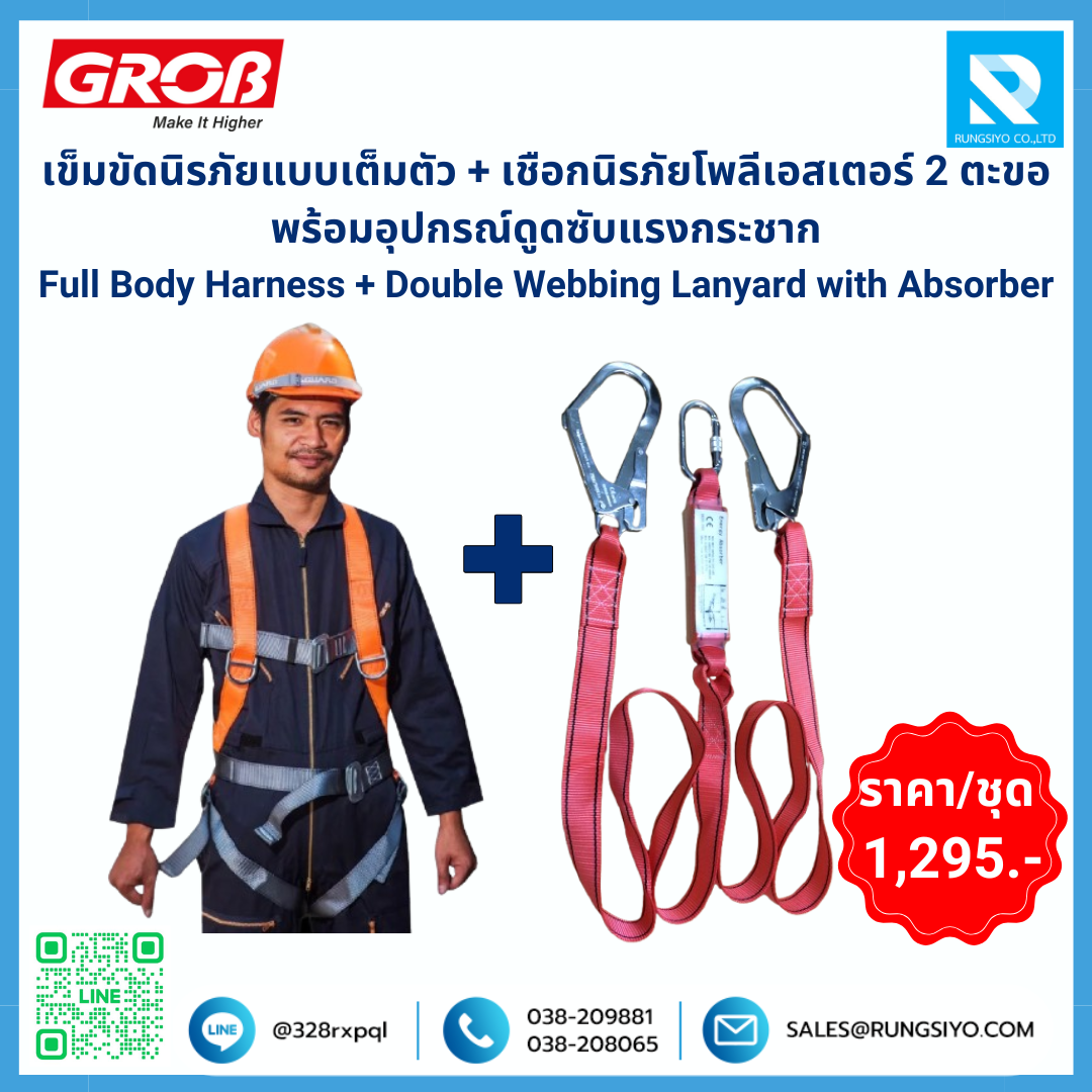 มี D-Ring 3 จุด ด้านหน้า 2 จุด ด้านหลัง 1 จุด WEBBING รับน้ำหนักได้มากกว่า 25 KN มาตรฐาน EN 361 : 2002 EN 362 : 2004 ISO 9001:2000 / CE 0321 Maximum Safe Drop 1.8 m. Safe work load 800 kgs